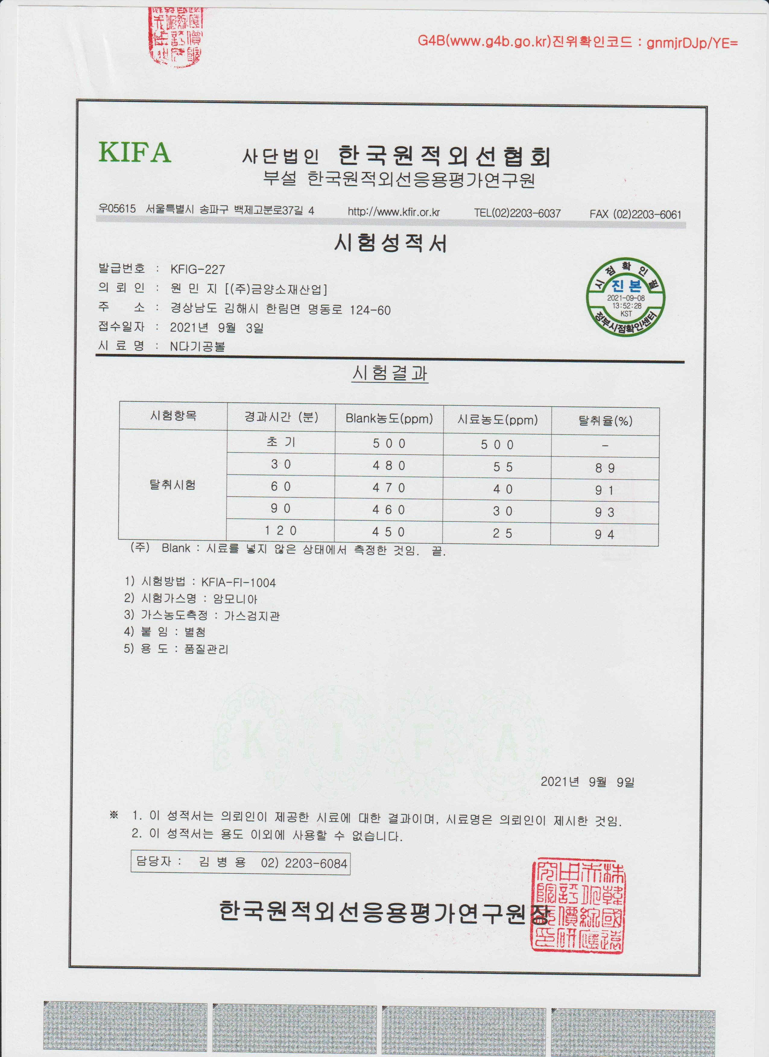 다기공 세라믹볼 탈취 성적서