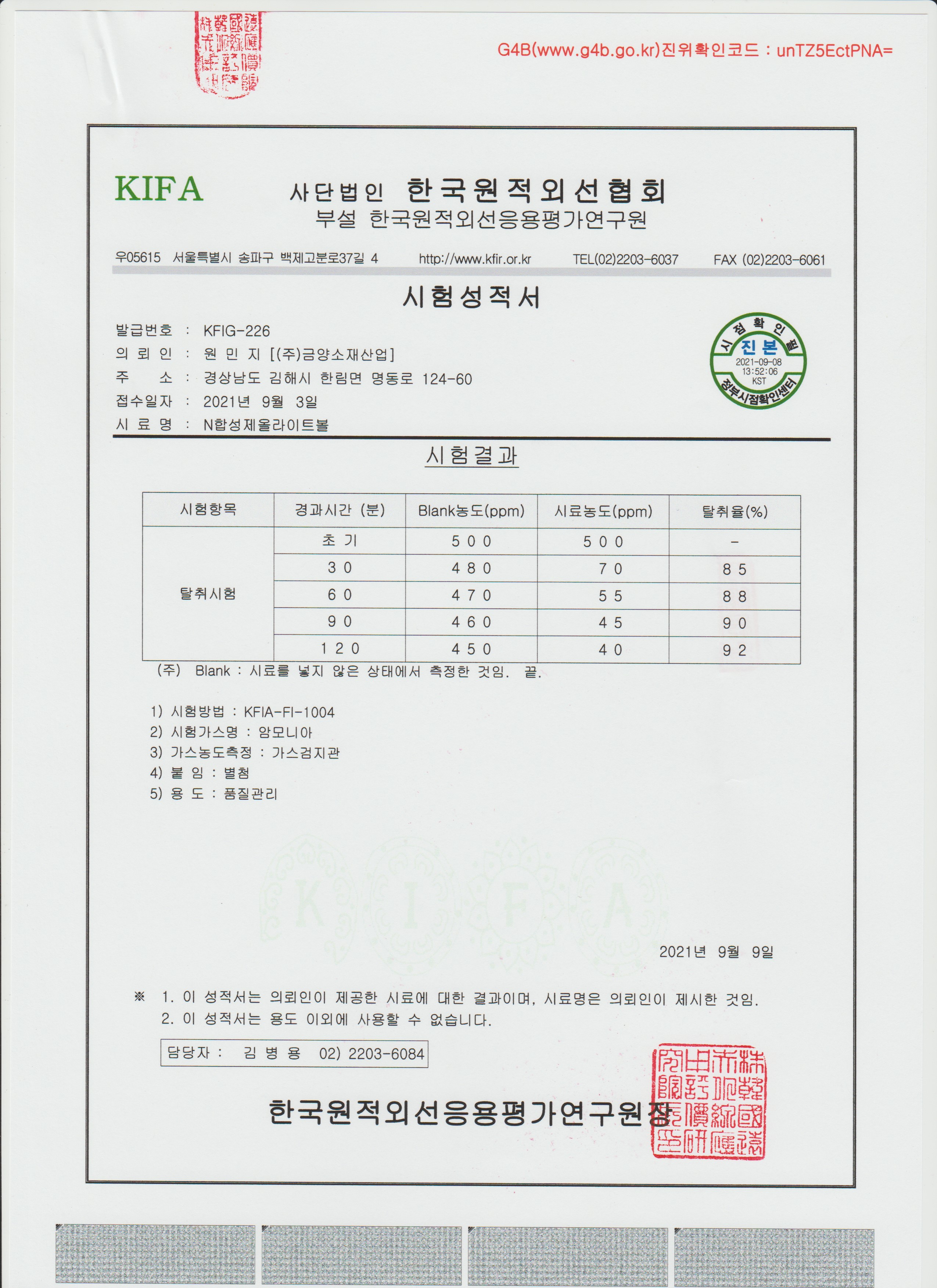 합성제오라이트볼 탈취 성적서